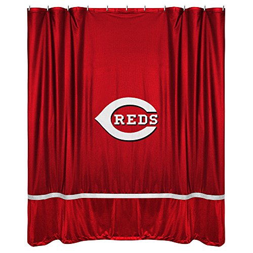 Description: MLB Cincinnati Reds side-lines shower curtain Reds , shower curtain is 100% polyester jersey, 72" x 72", with screen printed logo. Made in China finished USA.