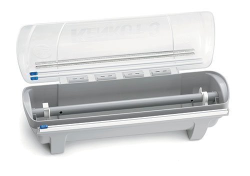 Description: Kenkut 3 is 100% more sanitary and 100% more professional than the cardboard cutter box for plastic wrap and aluminum foil found in every commercial kitchen. New & Improved with slide cutting feature For 12-18 inch rolls of film or foil up to 3000 feet long. KENKUT 3 is the #1 dispenser in the world for plastic wrap and aluminum foil Eliminates waste due to tangled rolls and from being thrown out when the cardboard box falls apart. *For institutional size rolls of foodservice film and foil. Not for use with grocery store size rolls Dimensions: 20"L x 8.5"W x 7"H